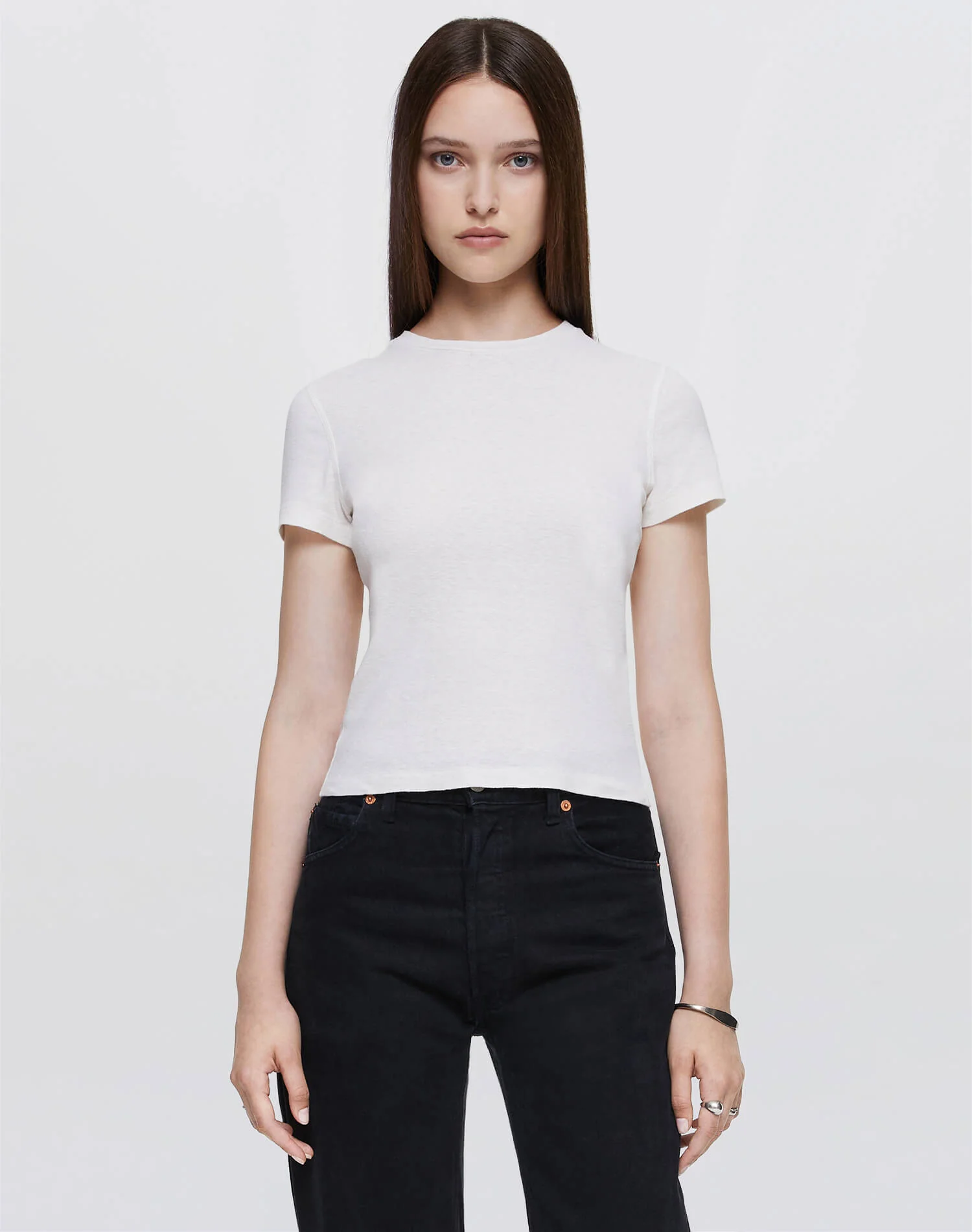 The 90s Baby Tee is inspired by the shrunken t-shirt silhouettes iconic to the decade. Made from our 30% recycled baby rib heritage cotton.