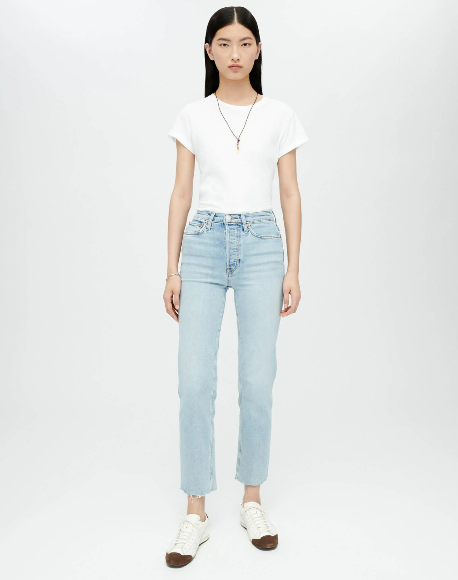 The 70s Comfort Stretch High Rise Stove Pipe in Mid 90s is our version of the classic 70s-inspired straight leg jean with cropped inseam. Features a 90s vintage inspired wash reminiscent of the decade in comfort stretch denim, a classic button fly, and a raw hem.