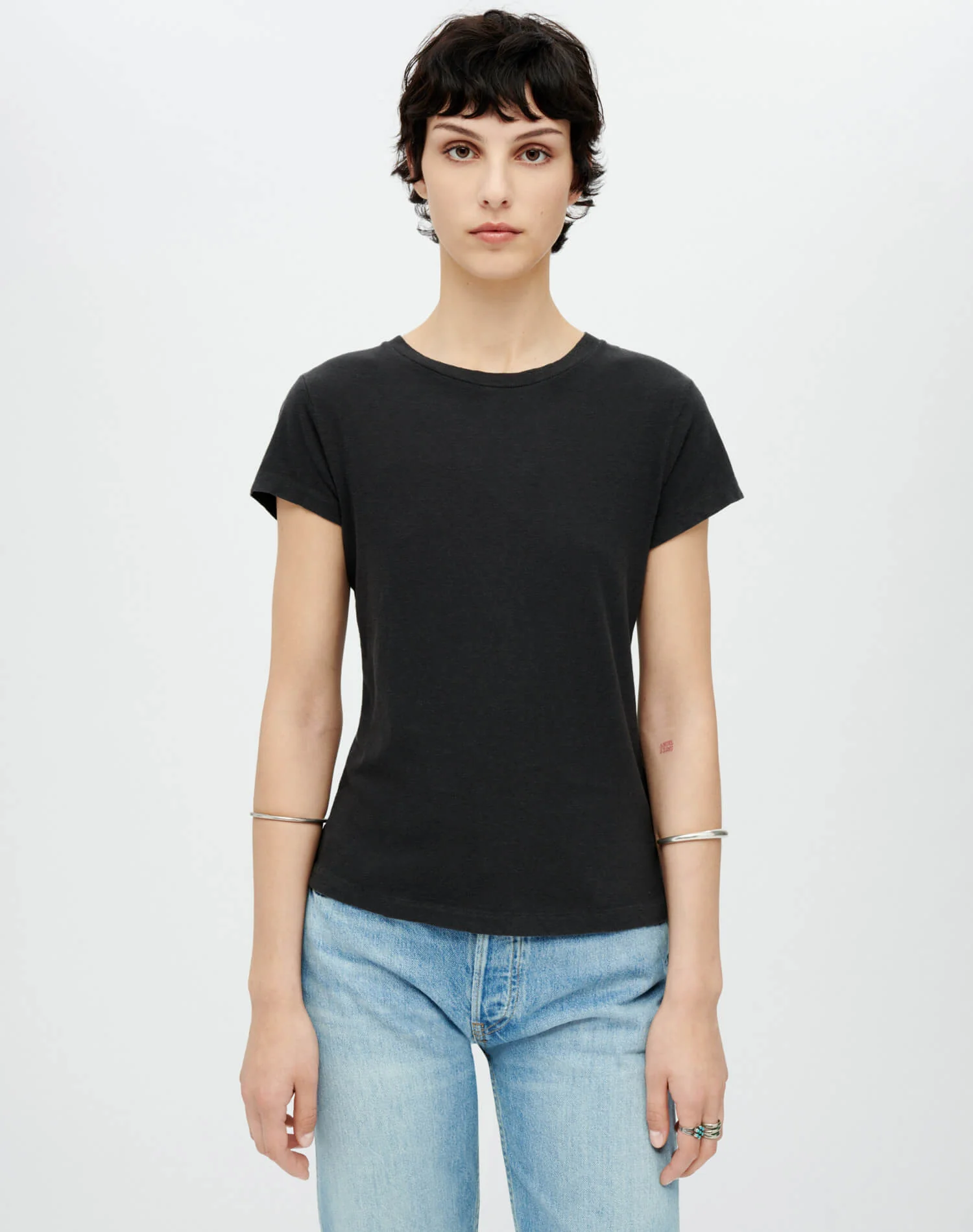 The RE/DONE | Hanes Slim Tee was inspired by one of fashion’s most iconic decades, the 1960s. This era of rebellion and freedom lent itself to a more fitted style of clothing. The classic crew neck tee with its slim body has the look of a vintage tee shirt that has been washed and worn hundreds of times. The tee shirts are made of 100% combed cotton, developed exclusively by RE/DONE | Hanes, knitted and sewn entirely in the USA.