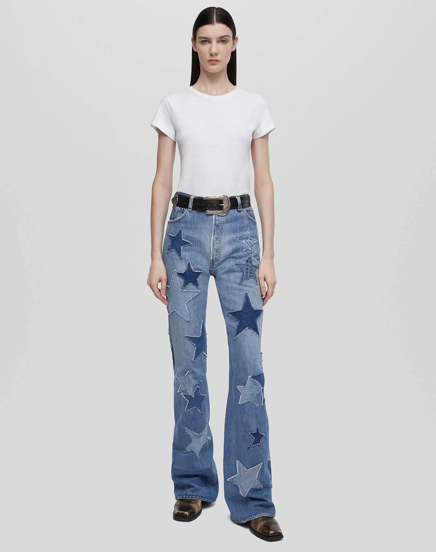 The Levi's Riding Jean is our take on the iconic western rodeo riding jeans. Features a snug top block and fitted through the thigh with a fit and flare attitude, star patch accents from vintage Levi's, full length inseam, classic button fly and finished hem.