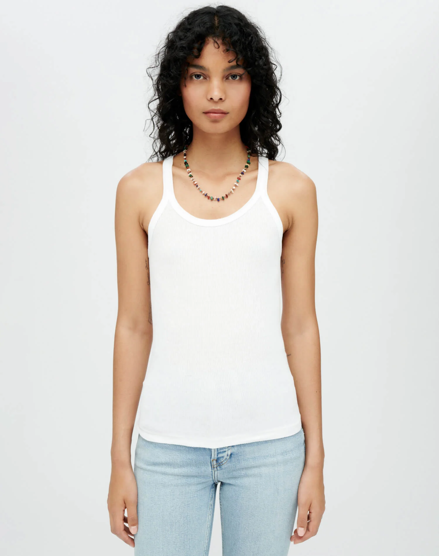 The RE/DONE Ribbed Tank is a modern take on the classic sleeveless men's undershirt. While its history may have been rooted below the shirt, this updated version can stand all on its own. The ribbed fabric with balanced tank straps flatters your figure. The tank can be worn confidently with the knowledge that the snug fit will keep all the important things in the garment.