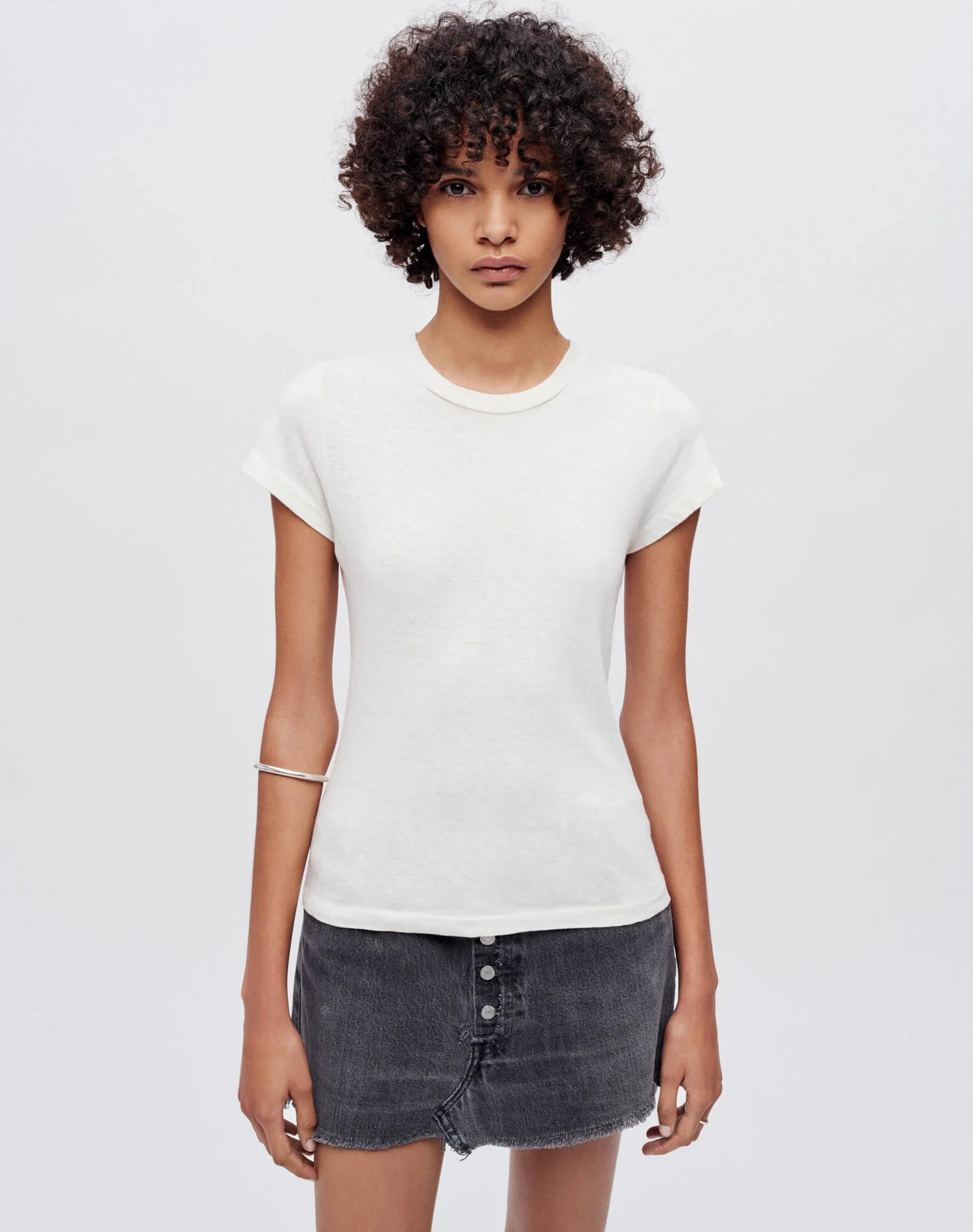 The RE/DONE | Hanes Slim Tee was inspired by one of fashion’s most iconic decades, the 1960s. This era of rebellion and freedom lent itself to a more fitted style of clothing. The classic crew neck tee with its slim body has the look of a vintage tee shirt that has been washed and worn hundreds of times. The tee shirts are made of 100% combed cotton, developed exclusively by RE/DONE | Hanes, knitted and sewn entirely in the USA. Fabric Weight: 6.5 - 7 oz
